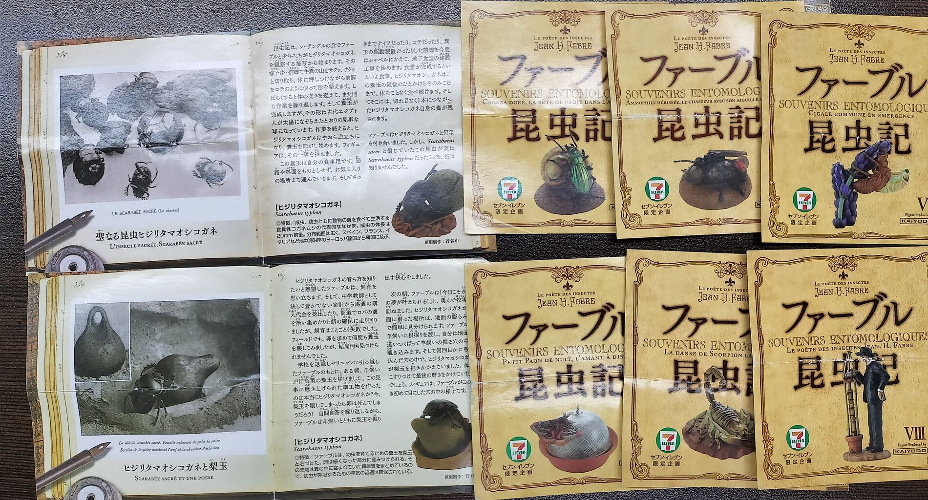 今回いただいたモノはまさに「珍品」です。セブンイレブン限定企画のペットボトル飲料のおまけ『ファーブル昆虫記』シリーズ(全8種類)で、原形制作は海洋堂なのでかなり凝った造りになっています。このおまけの解説書によると、ファーブルや昆虫記に関してはフランスの一般の人より日本の子供のほうがはるかによく知っているらしい。以下のタイトルからファーブル昆虫記の内容を語ることができる人、結構いるんじゃないかな?