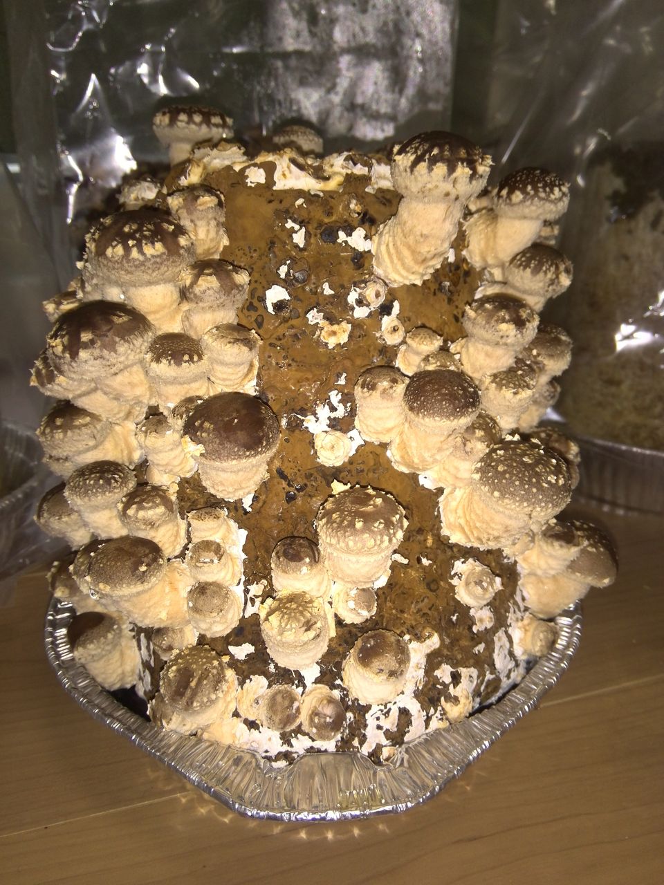 昨日のブログでは一抹の不安を感じさせる終わり方をしましたが、本日のタイトルのとおりシイタケはあっという間にキノコ(子実体)を形成し、わずか6日間で「860円のもとがとれた。」と確信するに至りました。