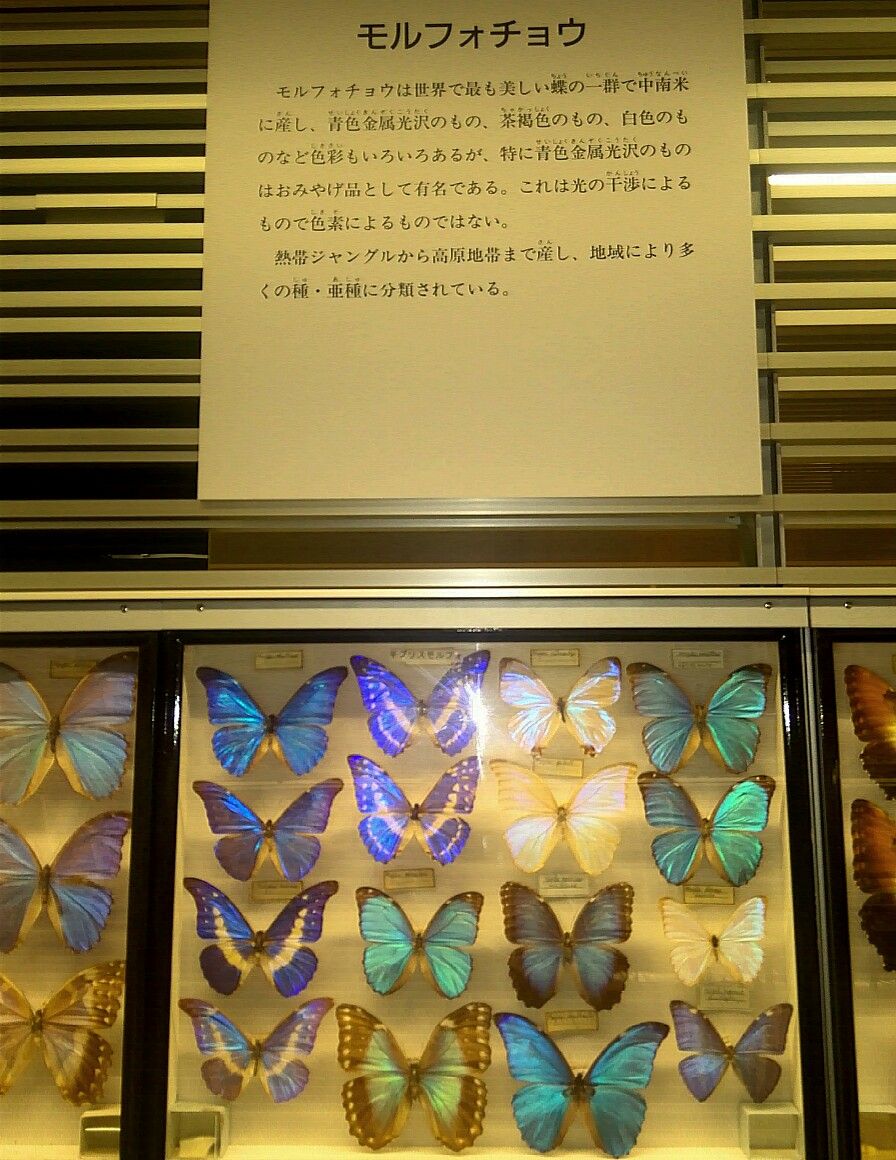 最後は美しい蝶でお口直しを。あまりに有名な生きた宝石、モルフォ蝶です。青く見える仕組みをここで語るとウザい奴と思われそうなので、写真だけにしときます。