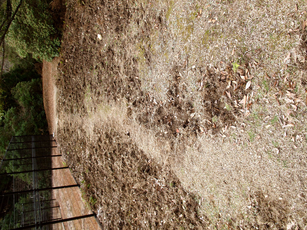 この原因と考えられるのが、イノシシの勢力拡大です。35年前もイノシシがところどころ掘り返す場所がありましたが、今はもういたるところが無残なまでに掘り返され芝生が荒れ放題。下の写真の柵の外側のモコモコはすべてイノシシの仕業です。マグソコガネは、このイノシシの糞で採集されました。昔はイノシシの糞はほとんど見ることがなかったのですが、おそらくイノシシの数が増え奈良公園での勢力を拡大するにつれて糞も増え、マグソコガネもやってきたのではないかと想像しています。私の35年間の空白を埋めてくれる糞虫ファンがいたら、ぜひ情報交換をさせてください。