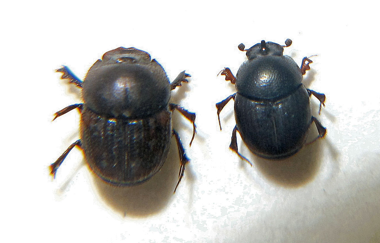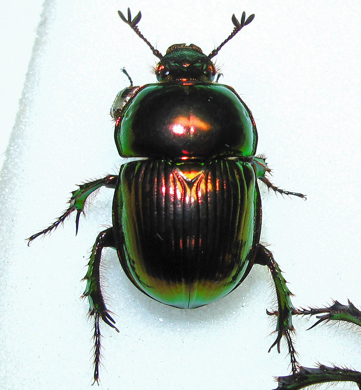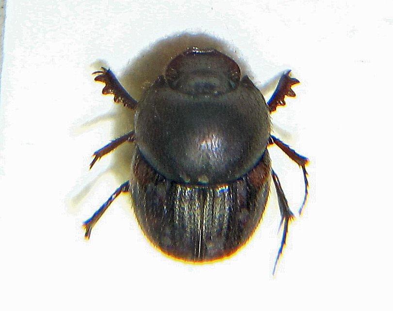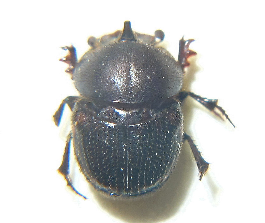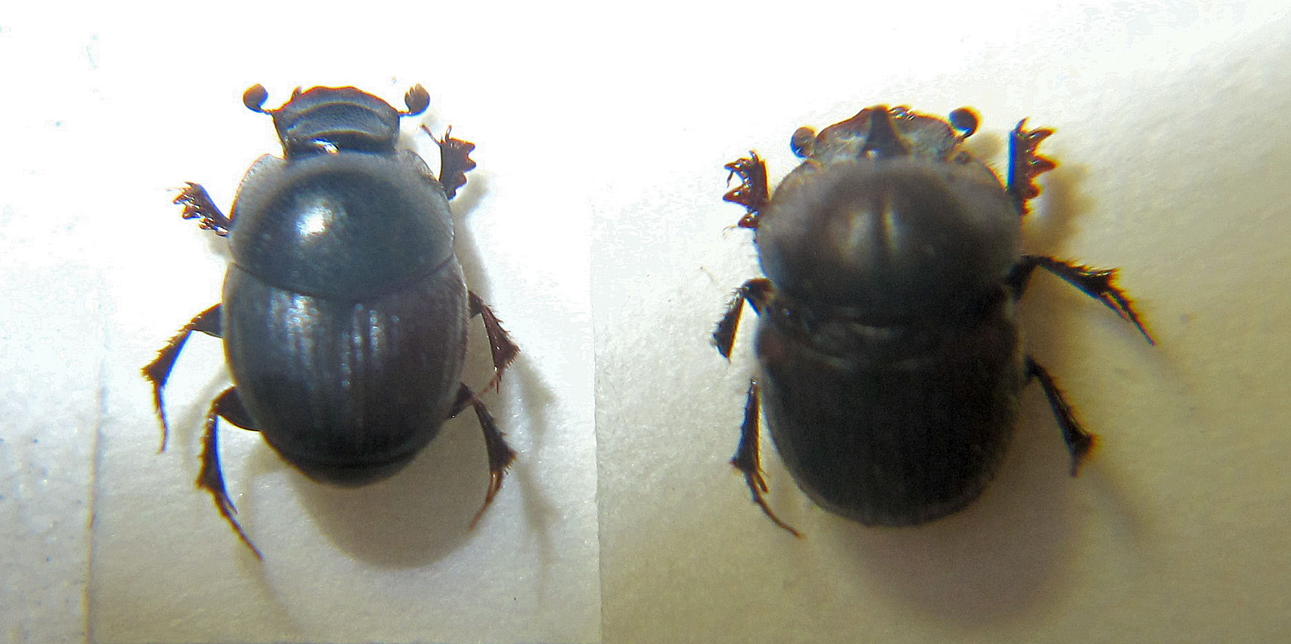 そこで、私が何をしたかというと、やっぱり糞虫の採集。シカの生息数の増加と生息域の拡大はここ妙見山でも顕著に見られるとのことで、ケーブルカーの山上駅周辺で簡単にシカ糞を見つけることができました。数日経過していると思われる鹿糞でチャグロマグソコガネ( Aphodius isaburoi )4頭のほか、歩行中のクロマルエンマコガネ(Onthophagus ater )♀1頭、オオセンチコガネ( Phelotrupes auratus )4頭(歩行中♂1頭、死骸♀2頭、飛行中1頭)を確認できました。歩行中のオオセンチコガネはこの夏に羽化したものらしくピカピカに輝いていました(写真1、2、4枚目)が、死骸は1年前に羽化した越冬個体と思われ、擦れて色ツヤがなく、脛の棘もすり減っていました(写真3枚目)。