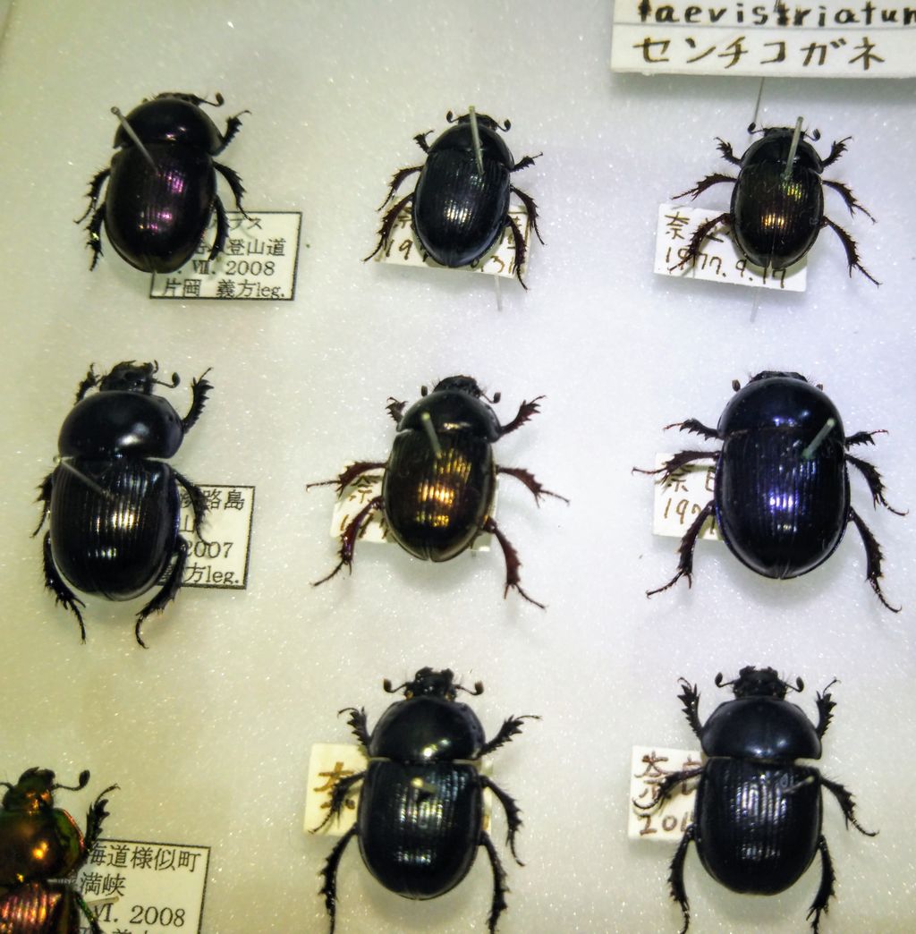 今日は、昨年通ったシニア自然大学校の大先輩が来館され、淡路島で採集した漆黒のセンチコガネ(最左列の上から2つ目)を寄贈してくださいました。奈良公園でも黒いセンチコガネはフツーに見られると思ってましたが、並べて見るとその差は歴然としており、奈良公園のはどれも青味がかった黒だったのです。淡路島では多くの個体が真っ黒なのでしょうか?またひとつ、楽しみが増えました。