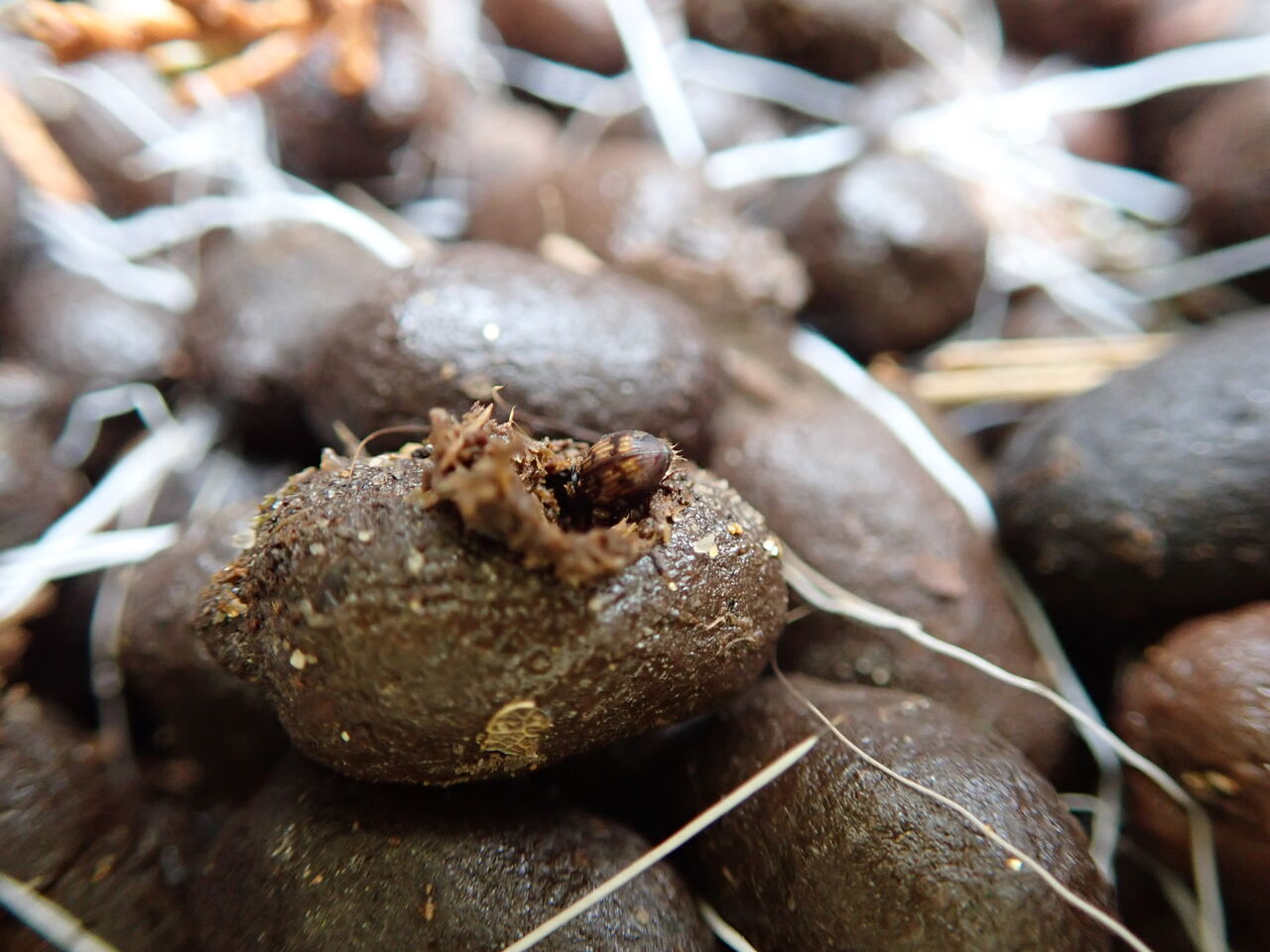 ケースにはコバエ防止の目の細かいネットを被せており、餌の羽毛や鹿毛は冷凍保存のものを与えているので、外部からの虫の侵入は考えにくいです。2019年の夏頃、卵やふ化直後の幼虫を撮影しているのですが、それと比べても大きな違いは見られません。状況からすると、コブナシコブスジコガネの卵ということになりますが、ただ、この季節に卵を産みますかね?60匹もいて2個だけというのも少し引っ掛かります。とりあえず、埋め戻して様子を見ることにしましたが、暖かい日が続いたりエアコンを入れたりで、間違って産んだのかもしれませんね⁉ でも、室温が20度を超えるのは、土日の午後の数時間だけで、平日5~10℃くらいしかありません。コブナシコブスジコガネは比較的低温でも産卵するのでしょうか。そういえば最初に長野の糞虫好きの方から送られてきた時には、成虫と一緒にすでに成長した幼虫も何匹かいたので、自然界でも春のまだ肌寒い頃から産卵する可能性も否定できない気もします。今後に注目です。