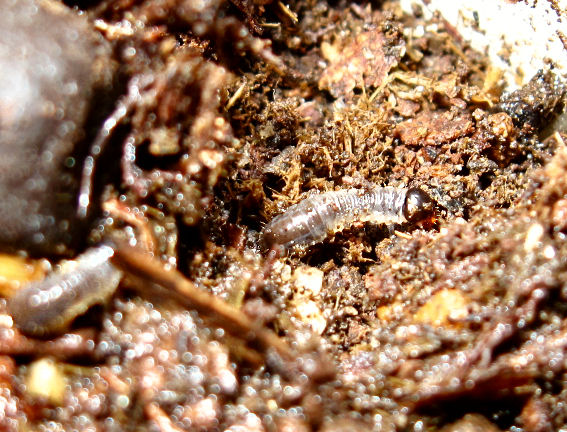 ここは4/1にセットして、粒糞と共にクロツヤマグソコガネ、クロマルエンマコガネ、ナガスネエンマコガネ、センチコガネを入れていたのですが、4/9に新たに粒糞2個入れるまでは地表に古くてマズそうな1粒を残すのみとなっていたのです。なので、4/9の新鮮な粒糞にセンチコガネが大喜びしたのです。4/10のブログにある通り、1粒はクロツヤマグソコガネにより粉々にされており、残されたもう一粒をどけると幼虫がいたというわけです。この2匹、いったいどこから来たのでしょう?(写真2,3枚目)