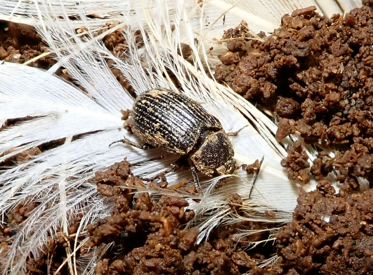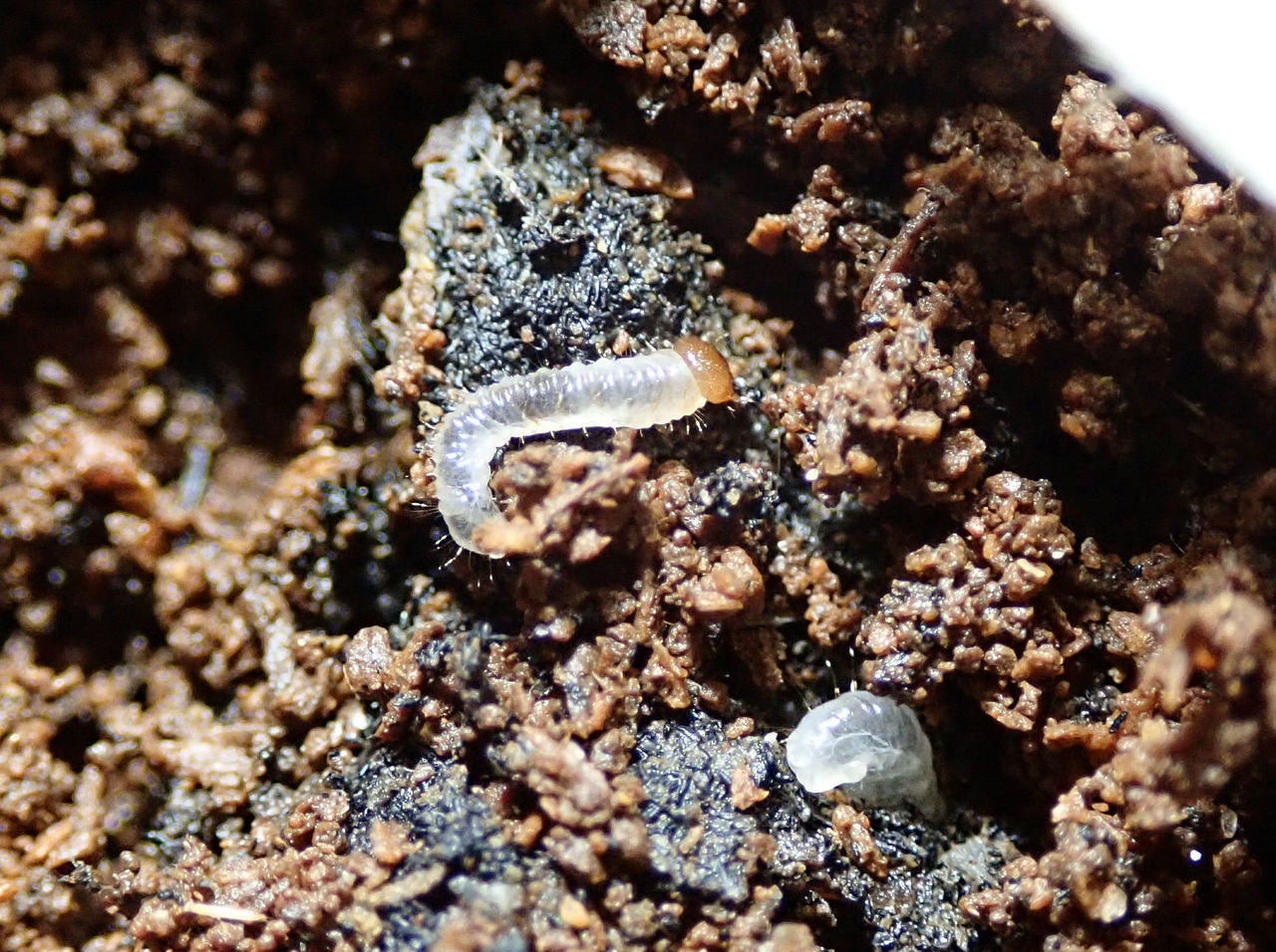 飼育容器には少ししっとりとした赤みのある朽木のフレークに獣糞と鳥の羽を混ぜて満たしてあり、コブナシコブスジコガネは、硬めのフェザーもふわふわのダウンも、どちらも気にせず食べるようです。私は今年ヒメコブスジコガネを獣糞の下から2回計3匹見つけてますが、ここで一緒に飼ってるヒメコブスジコガネも羽を食っており(写真3枚目)、今のところどちらも好んで獣糞を食べている様子は観察できていません。でも、よく見ると獣糞(黒いところ)にはこんなのが・・・(写真4枚目)
