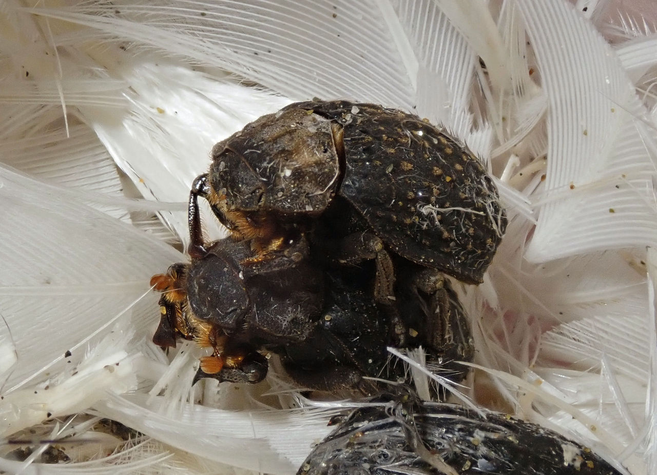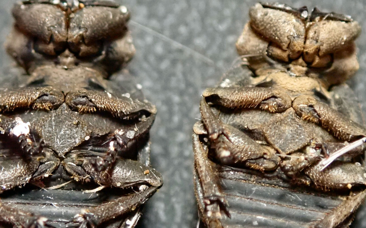 我が家に来てすでに10日以上が経過、オス・メス揃えて送ってくださったので、さっそく交尾らしき行動も見られました(結合現場は未確認)(写真1枚目)。オスメスの区別はわかり易くて、中脚の太腿に金色の剛毛がたくさん生えているのがオス(写真2枚目)、無いのがメス(写真3枚目)です。冬場の低温に弱いようなので、秋までに糞虫専用の飼育観察室を作って温度管理し、アフリカのフンコロガシなどと一緒に通年飼育する計画を進めています。お楽しみにー。