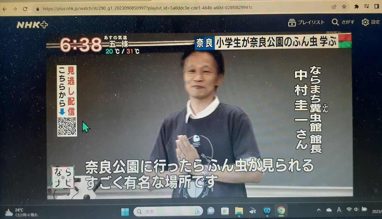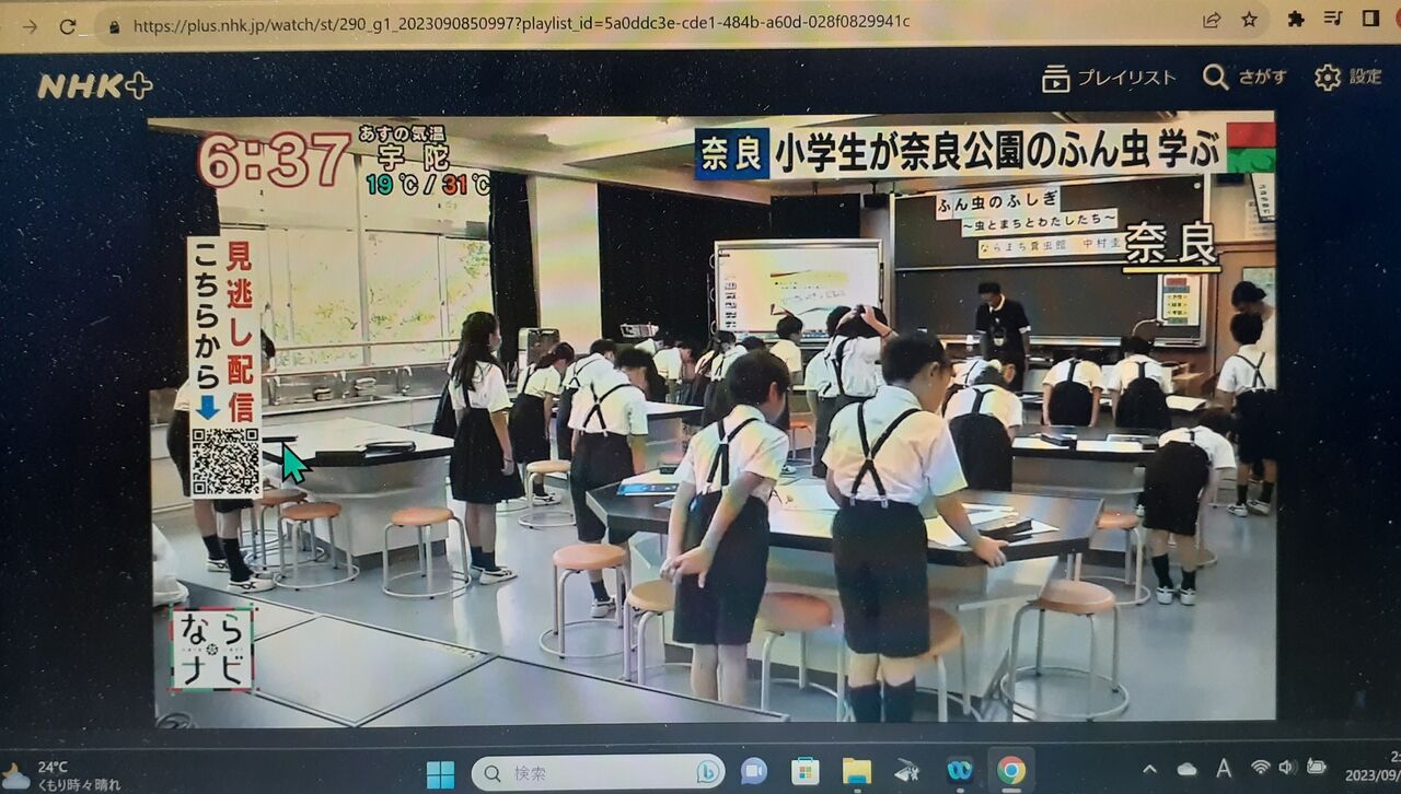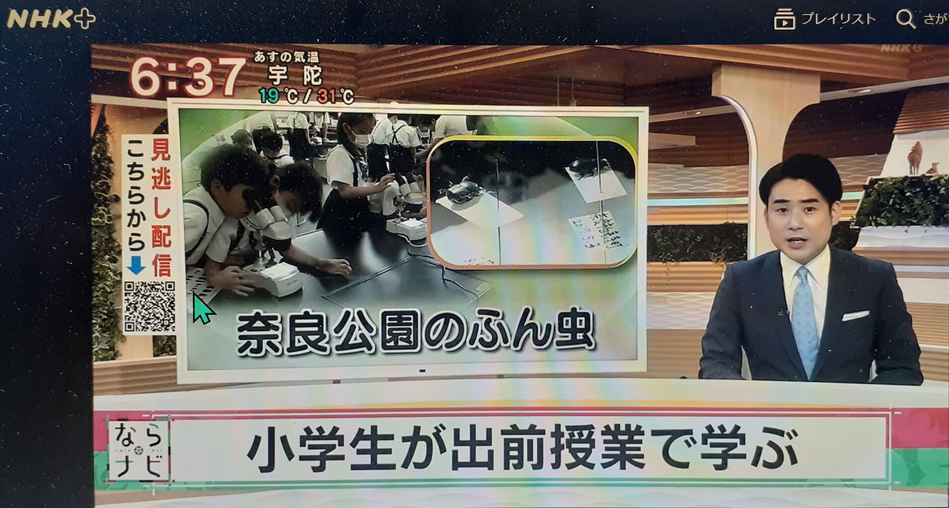 NHKテレビは当日9/8のお昼のNHKニュースで放送されたようですが、夕方6:30の「ならナビ」でも放送されました。放送後1週間はNHK+(プラス)という見逃し配信サービスで無料で見ることができます。ならナビは午後6:30からですが、午後6:37~6:39が「小学生が奈良公園のふん虫学ぶ」です。新聞を買いそびれたので未確認ですが、奈良新聞には9/9に掲載されたそうです。