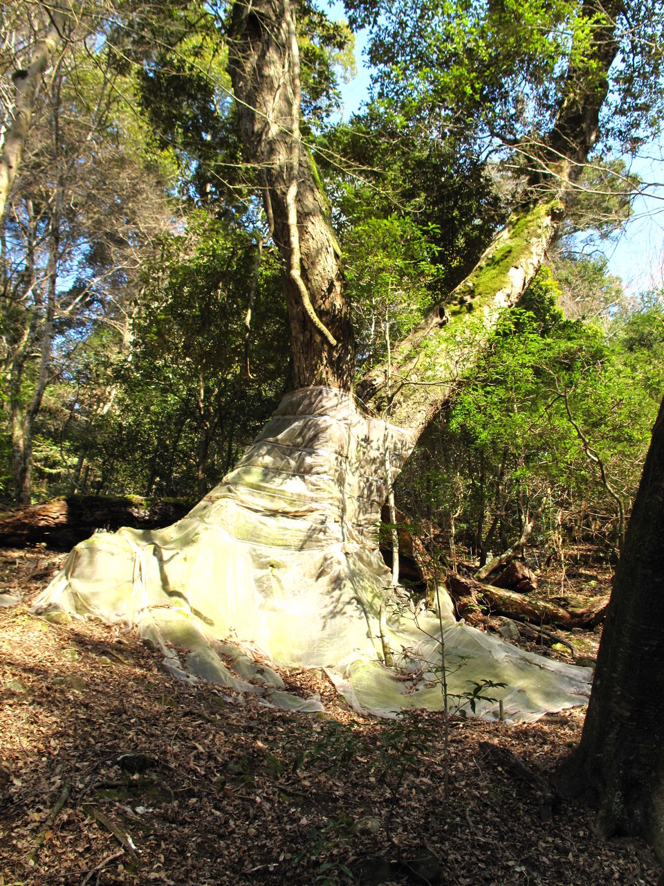 〔↑防虫ネットを施したイチイガシ。効果はいま一つとのこと〕