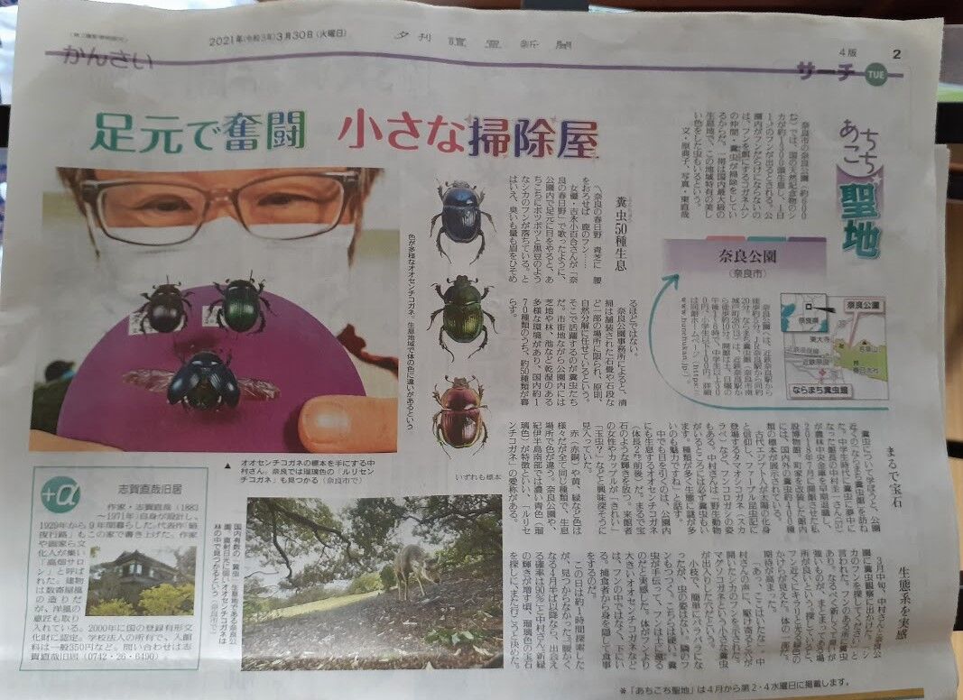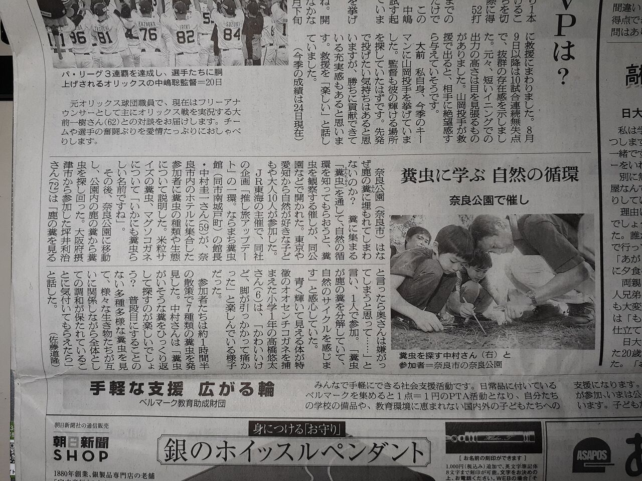 この糞虫ツアーを取材してくれたのが朝日新聞。当日(9/16土)はホテル尾花での糞虫講座から参加し、観察ツアー終了後にお話をしたほか、後日メールのやりとりをするなど熱心な記者さんでした。その記事がこれ。こういうの、嬉しいですね!