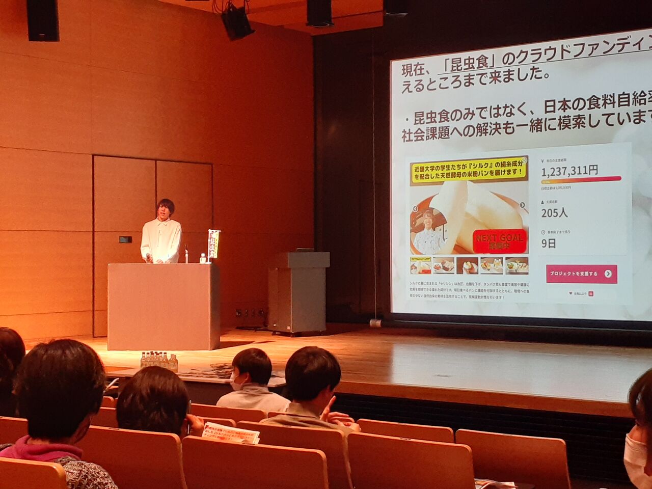 講演は実質90分程(写真2枚目)でしたが、「地球を救う昆虫食とSDGsの話」のタイトル通り昆虫食がいくつものSDGsの目標達成に役立つことをわかり易く紹介されていました。私的にはやはり前半の昆虫食の普及活動の際のおもしろ体験やシルク食品開発秘話みたいなのがめっちゃ楽しめました。私が糞虫を紹介する時の相手のリアクションと共通するところも多く、ニヤニヤしつつやたら頷きながら聞いてました。世界には糞虫スナックや糞玉を食べる人もいますからね。