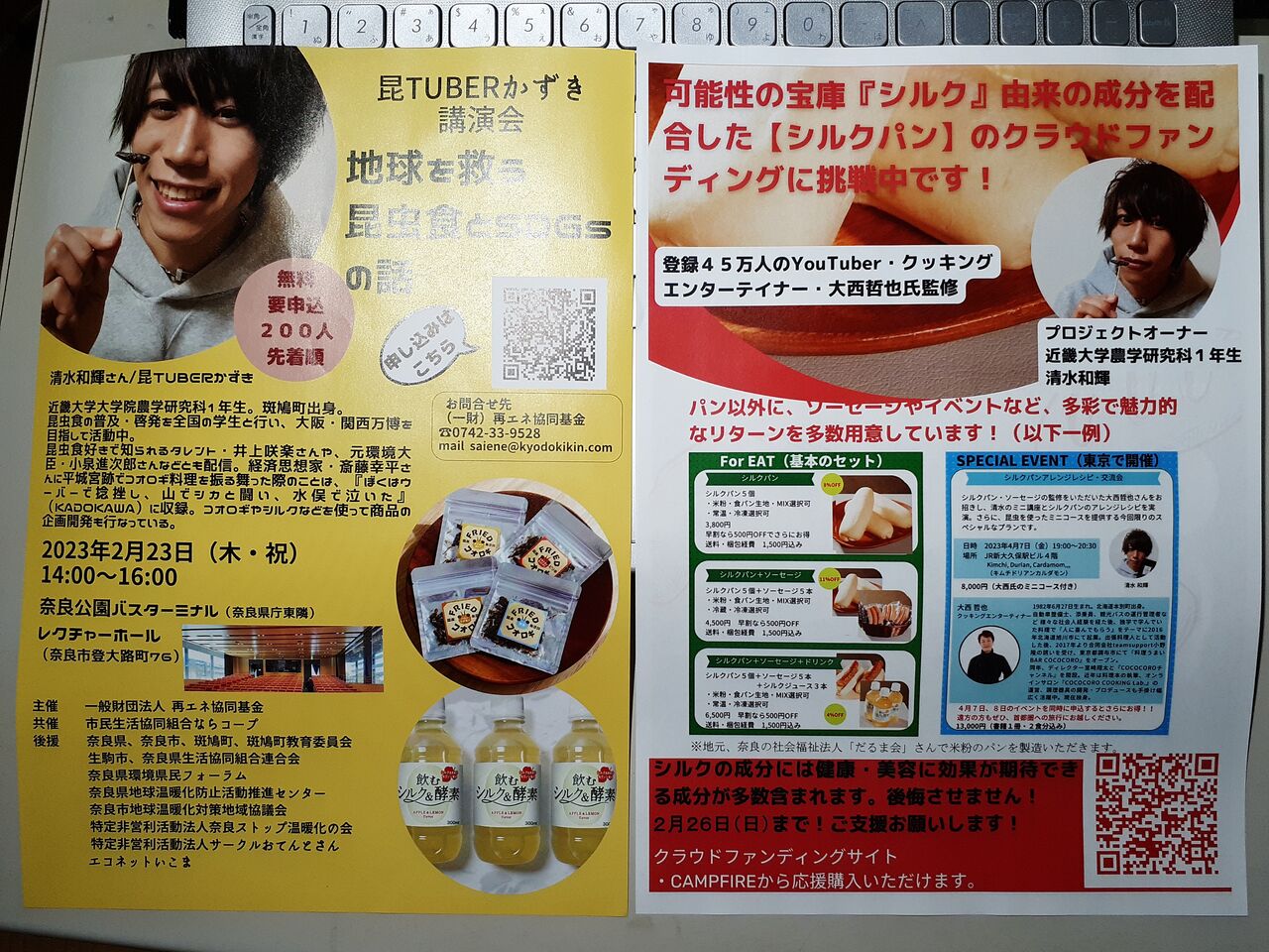 以前、新聞か雑誌で昆虫食にハマっている大学生として大きく取り上げられているのを見て、一度お会いしたいなぁと思いつつも、いつものようにぐずぐずして数年が経ってました。先日、友人から彼の昆虫食の講演会のチラシ(写真1枚目)をもらい、行ってきました。