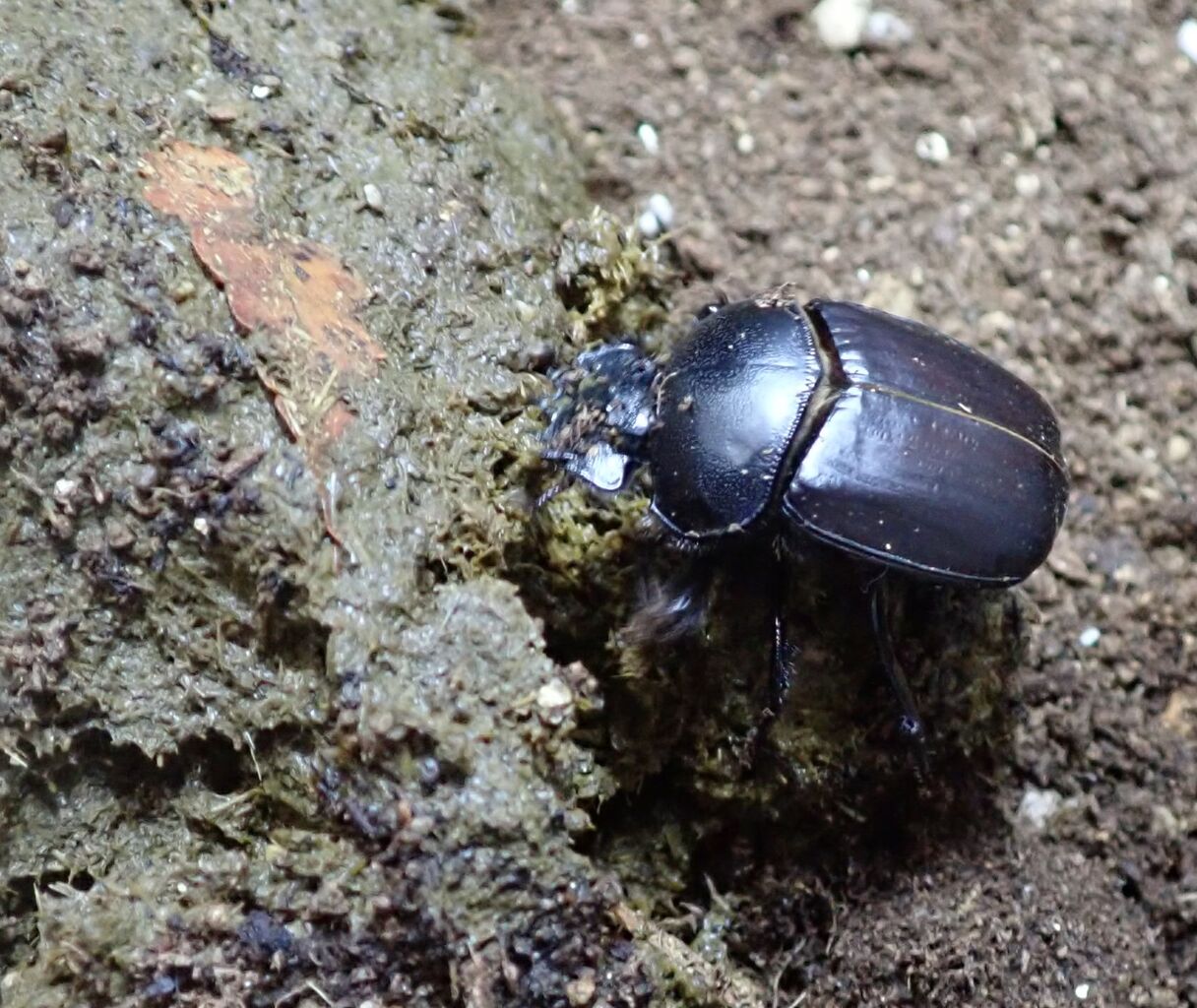 オスが土に埋めた糞玉は完全にバラバラに破壊され食べられ、フンコロガシの糞にまみれます。写真の地下室にある木屑の様なものがスカラベが食べ残したシカ糞に含まれる植物の繊維で、ツヤのあるミミズみたいなのがスカラベの糞です。