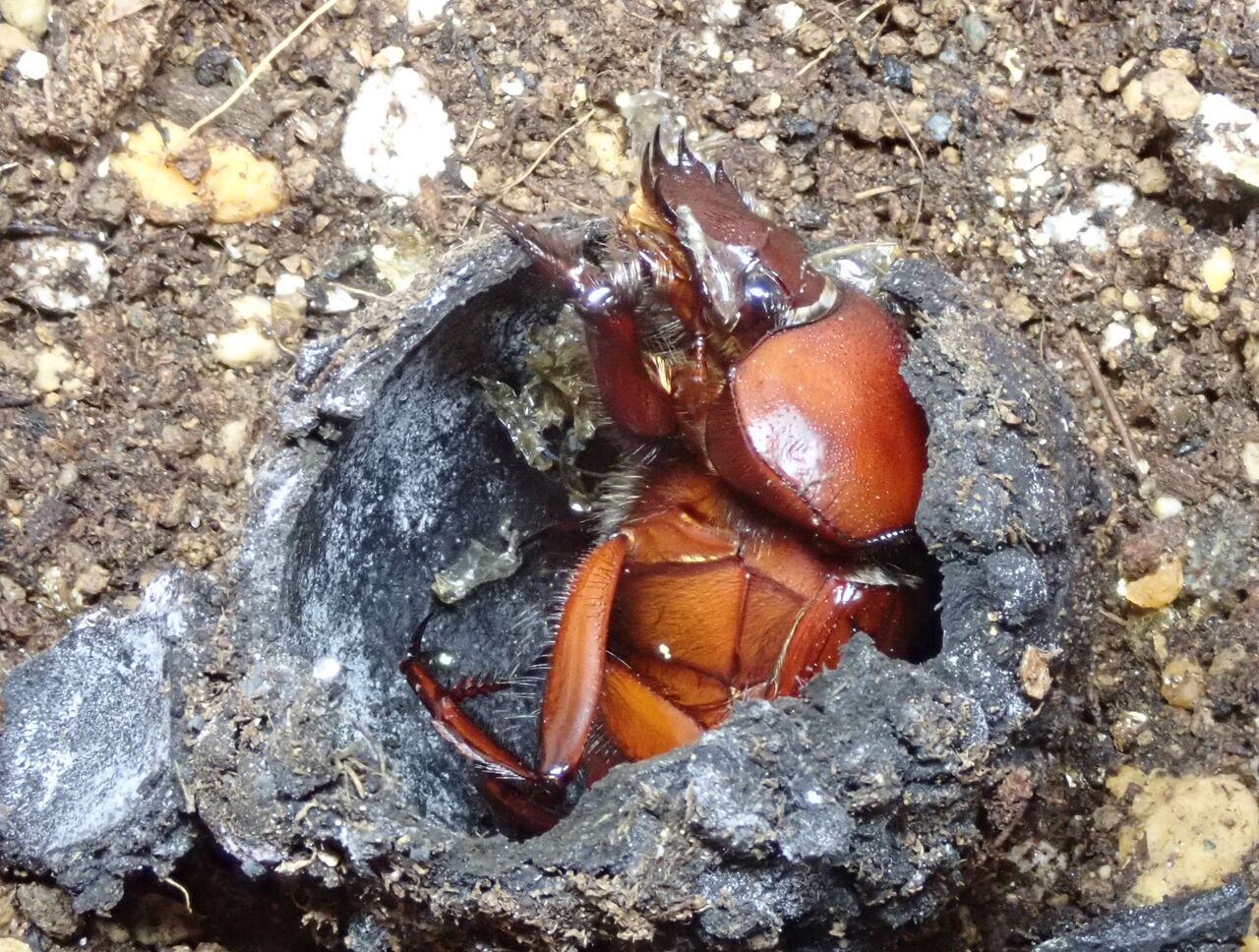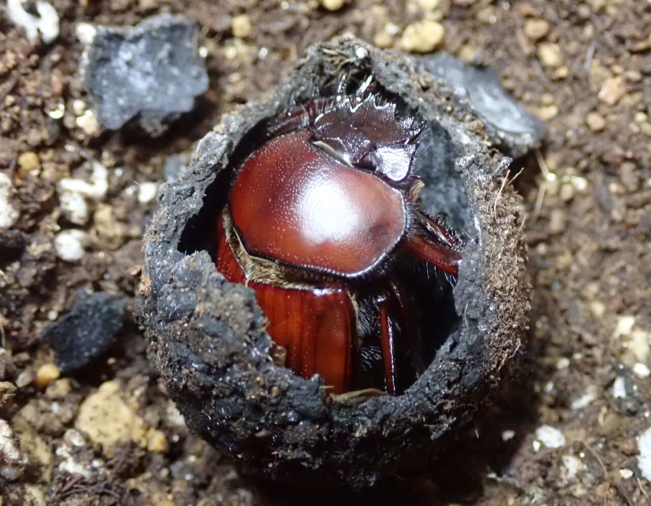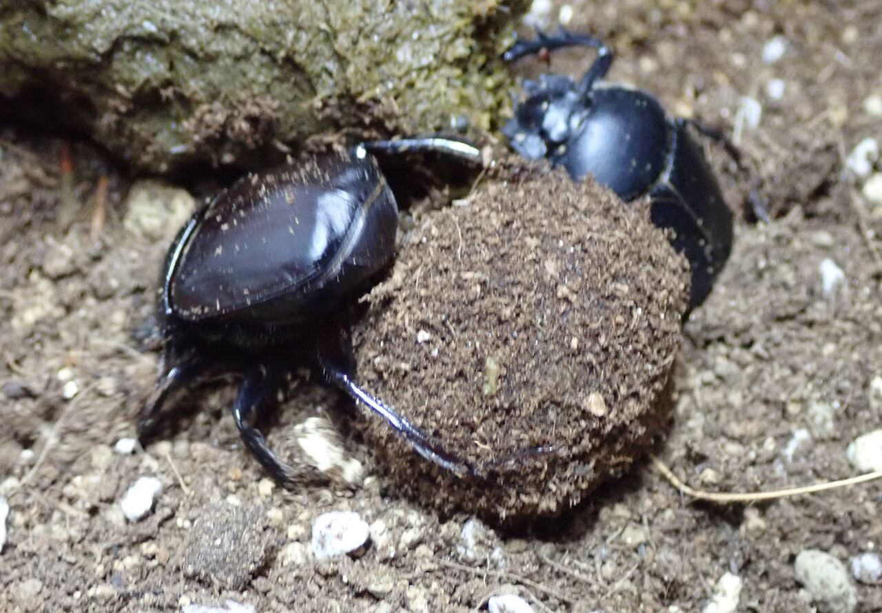 先月、よく行くフツーのペットショップで、フンコロガシ(スカラベ サクレ)を見つけました。入荷したばかりで元気だったので、3匹全部お持ち帰り。一匹が4,500円程で安くはなかったのですが、去年は買えなかったので奮発しました。一昨年は繁殖にも成功しているので、糞虫館で累代飼育していつでもフンコロガシているところが見られたら楽しいでしょ?3週間が経過し、これまで累計7つの糞玉を土に埋めましたが、2匹はどうやらオスらしく、1週間ほどで糞玉を食べ尽くして出てきます。残る1匹はプラケースの壁面から見えないところに埋めたので様子が分かりません。3匹ともオスの可能性は8分の1(12.5%)しかないので、1匹くらいメスがいてもおかしくはないのですが。