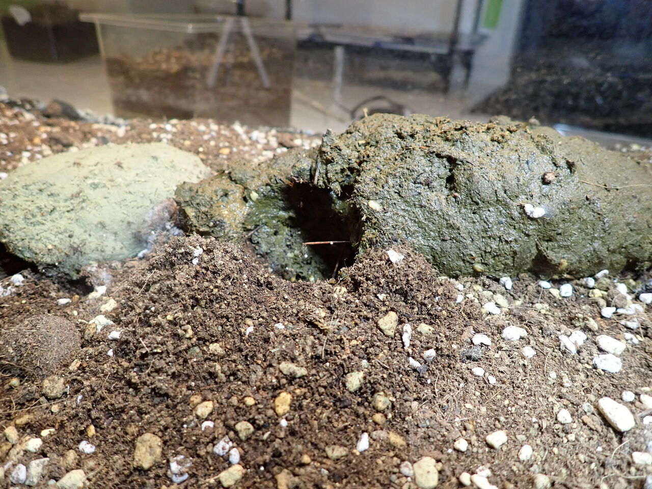 アフリカの自然公園で野生動物を見るサファリツアーに参加したら、動物の糞に虫がいっぱい集まっていてフンコロガシがフンの玉を転がしたのを見た人もいるのですが、フンコロガシをメインで見に行くには個人で行くしかなく、観察中にライオンに襲われたらイヤだしなー。これらの写真は、糞虫館でスカラベ・サクレが糞玉を作った時のもので、私はこの目で糞玉つくりや糞玉コロガシなどを見ているのですが、「奈良公園で生きたルリセンチコガネを見たい!」と思うのと同じで、やはり現地の自然の中でフンコロガシを見たいという思いは強くなるばかりです。